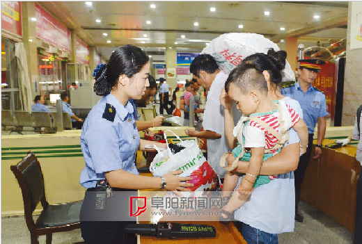 潁州晚報(bào)記者從鐵路部門獲悉,為確保抗日戰(zhàn)爭(zhēng)勝利70周年紀(jì)念活動(dòng)的安全,阜陽(yáng)火車站安檢已升級(jí),近期對(duì)所有乘坐進(jìn)京列車的乘客進(jìn)行二次安檢,時(shí)間持續(xù)至9月5日。